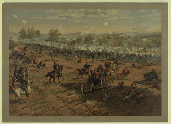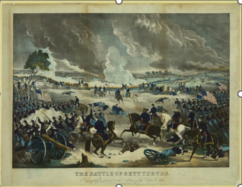 A print depicts Union troops advancing from the right during the Battle of Gettysburg. (Library of Congress)