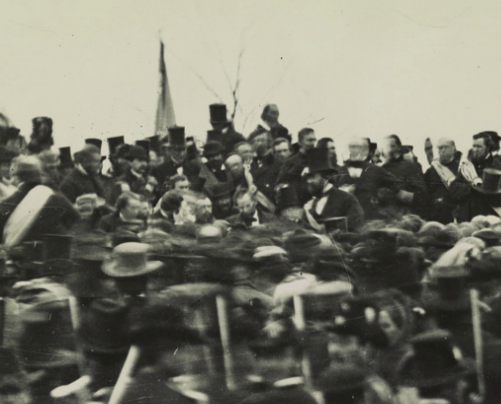 Abraham Lincoln (center) gives the ‘Gettysburg Address’ to a crowd gathered for the dedication of the Soldiers’ National Cemetery. (Library of Congress)