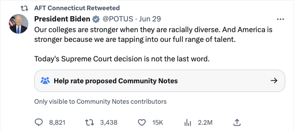 The Connecticut American Federation of Teachers (AFT) did not issue a statement, but they did retweet President Joe Biden who said, “Our colleges are stronger when they are racially diverse. And America is stronger because we are tapping into our full range of talent.”