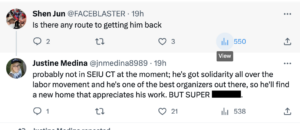 In response to a question about Caraway getting his job back, Medina tweeted, “Probably not in SEIU CT at the moment; he’s got solidarity all over the labor movement and he’s one of the best organizers out there, so he’ll find a new home that appreciates his work.”