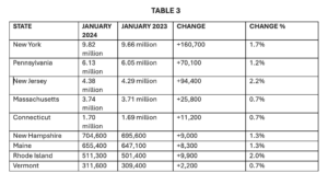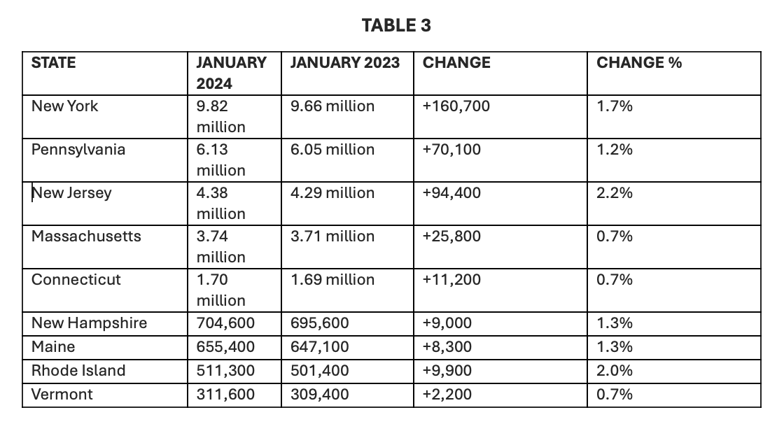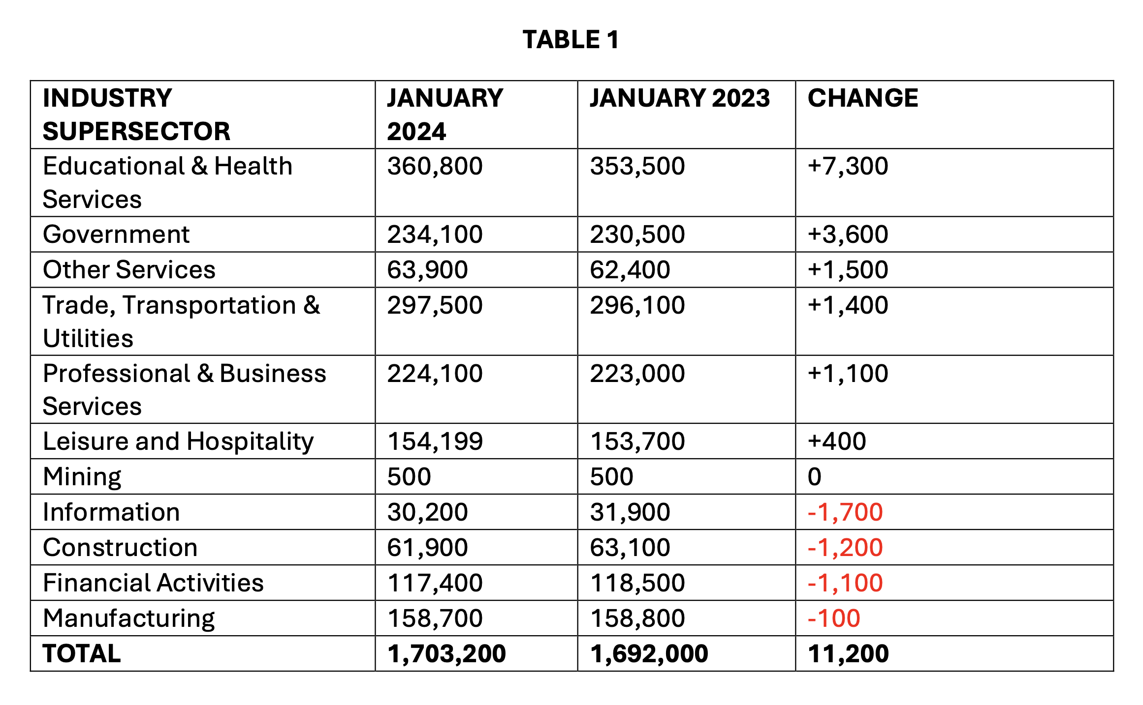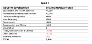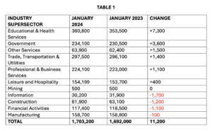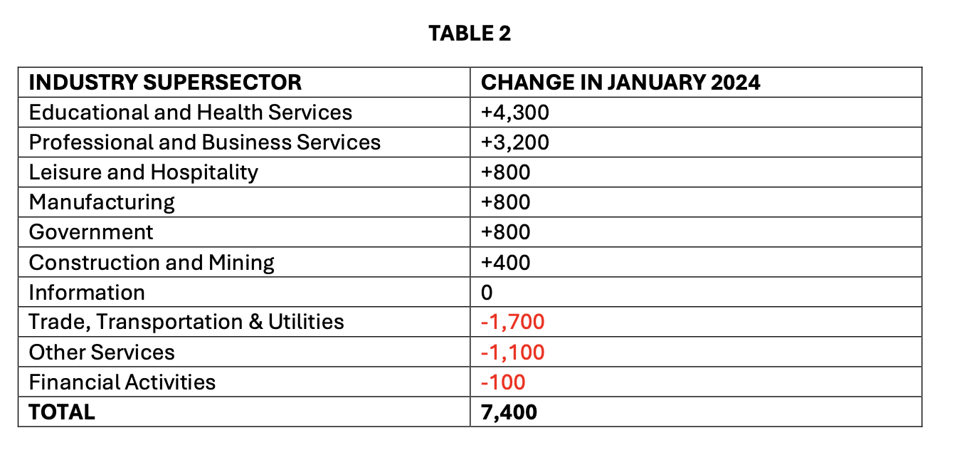 The annual benchmark report coincided with an account of January 2024’s job numbers, which also experienced growth, adding 7,400 new jobs in six of the ten state supersectors. (See Table 2 Below for Exact Numbers)