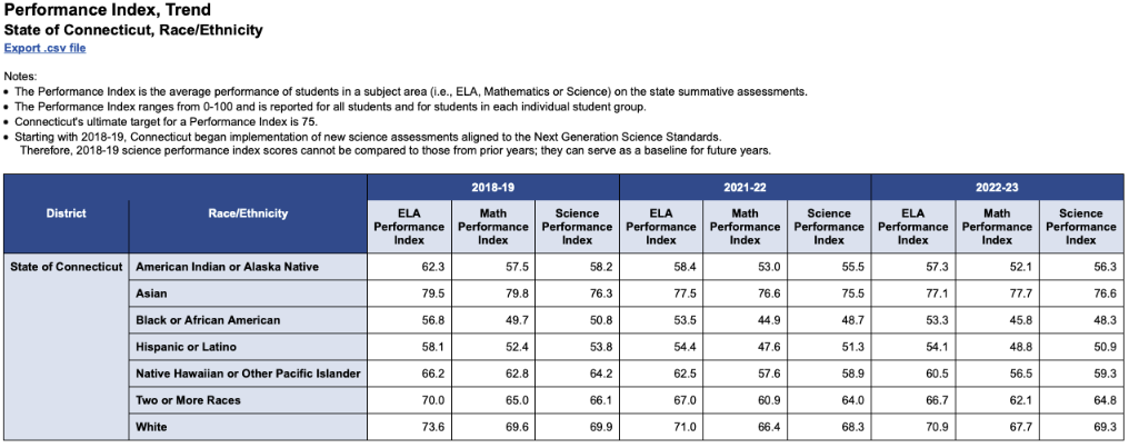 CTDOE reports that students across the state, regardless of race, did not reach the levels of proficiency in math, English language arts and science seen before the pandemic (2018-19). An outlier to the trend is the performance of Asian students who have shown a slight improvement in science.