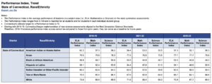 Notwithstanding rising spending, student achievement outcomes are mirroring the decline in enrollment. According to the state’s Performance Index, which measures the average performance of students in Math, English Language Arts (ELA), and Science, students have yet to recover academically to pre-pandemic levels. The index ranges from 0 to 100, with a state target of 75.