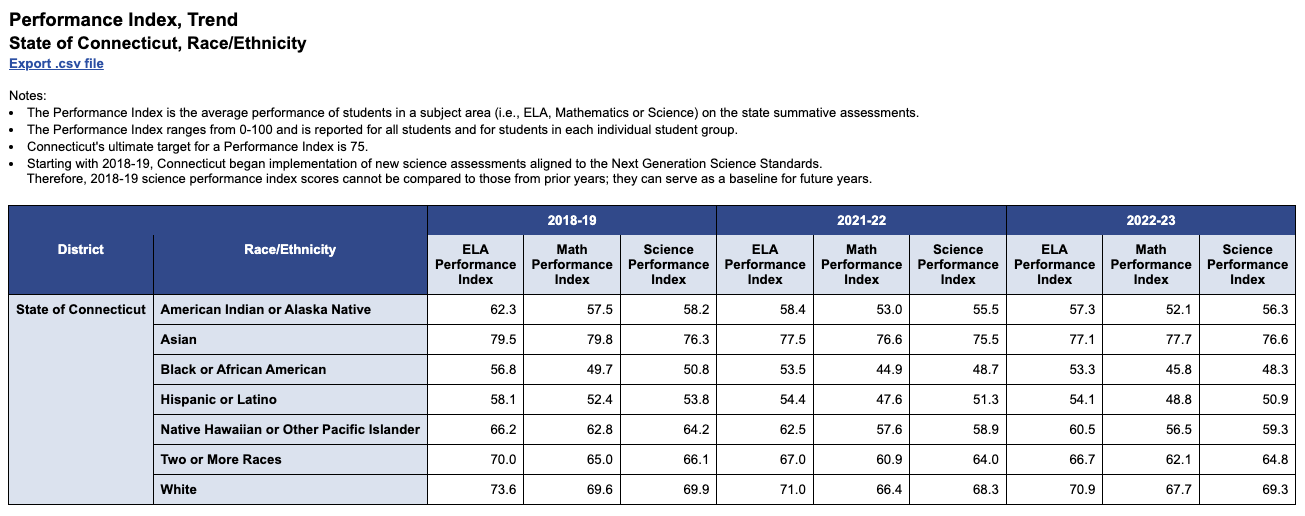In the 2018-2019 school year, the state averages for all students, regardless of race, were 67.7 in ELA, 63.1 in Math, and 63.8 in Science. By the 2022-2023 school year, these averages had dropped to 63.9 (ELA), 59.7 (Math), and 61.6 (Science).