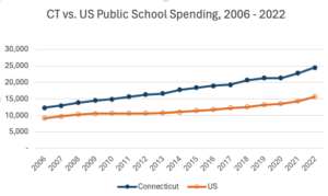 Despite Connecticut’s spending increase of $1,684, or 7.4%, over 2021 — falling below the national average — the gap between national and state expenditures continues to widen. In 2006, the state’s per pupil spending was $12,323, which was $3,184 more than the national average. By 2022, this gap had grown substantially, with Connecticut spending $8,820 more per student than the national average.