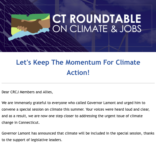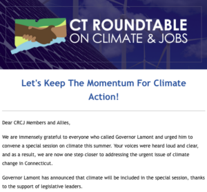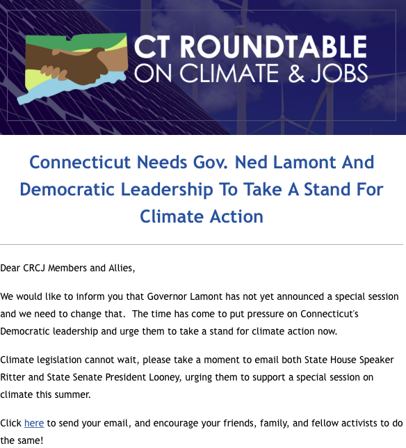 Despite this, environmental advocates appeared to misunderstand the situation and sent out a misleading email suggesting they had bypassed the Senate President’s authority. On June 6, the CT Roundtable on Climate and Jobs claimed in an email that “Governor Lamont has announced that climate will be included in the special session, thanks to the support of legislative leaders.”