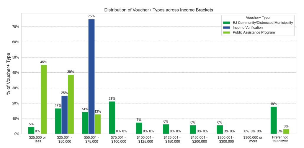 Individuals opting for public assistance or income qualification pathways for rebates reported an adjusted gross income (AGI) of less than $75,000. In contrast, 25% of those from the EJ Community/Distressed Municipality group reported incomes over $100,000.