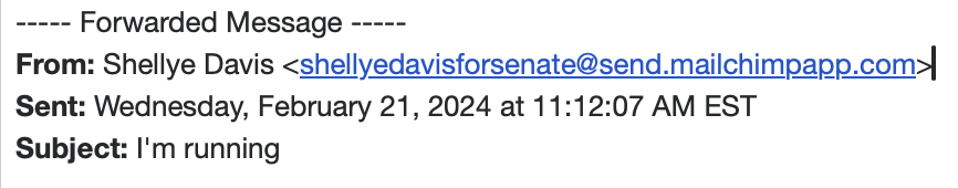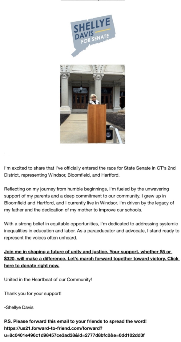 A source recently shared with Yankee Institute a Feb. 21 email from Davis announcing her candidacy for the 2nd District (Windsor, Bloomfield and Hartford). In the email, titled “I’m running,” Davis stated, “I’m excited to share that I’ve officially entered the race.”