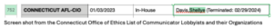 Even though Davis officially ended her status as a lobbyist in February, she remained active at the Legislative Office Building (LOB). In addition to her lobbying activities, Davis is a paraeducator in the Hartford public school system and reportedly skipped class on March 6th to testify at the Finance, Revenue and Bonding Committee Public Hearing on behalf of the CT AFL-CIO. The bill she supported aimed to increase personal income tax marginal rates and establish a capital gains surcharge to fund a child tax credit, a mill rate cap, municipal reimbursements for the cap, and support for certain higher education programs.
