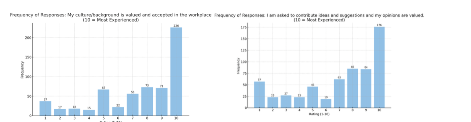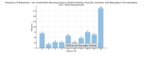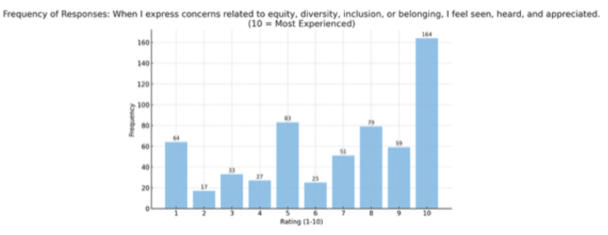 Those who did respond were asked to rate various scenarios on a scale from 1 to 10, with 10 being the most experienced. As for the questions, employees shared whether they felt heard when raising EDIB-related concerns and if they’re comfortable discussing EDIB topics. Most responded positively.