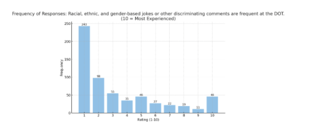 For example, one question asked if “racial, ethnic, and gender-based jokes or other discriminating comments are frequent at the DOT.” This kind of direct suggestion of bad behaviors might cause respondents to view their workplace experiences through a negative lens, even if these problems are rare or nonexistent. By implying that these issues are the norm could manipulate the reader to overstate problems they might not have otherwise experienced.