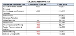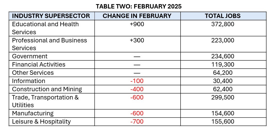 Yet, despite the job gains in 2024, the February 2025 DOL report — released in conjunction with the year-end examination — showed a decline by 1,200 in nonfarm industry positions, and a slight uptick in the unemployment rate from 3.3% to 3.4%. (See Table Two)