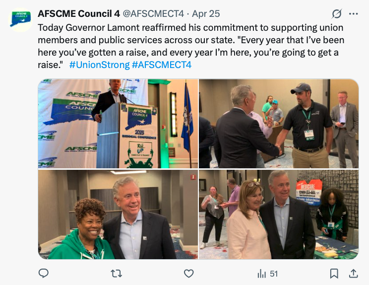 Speaking to nearly 200 union members gathered at AFSCME’s “Rise Up Connecticut & Organize” convention at the Mystic Marriott in Groton, Gov. Lamont proudly stated, “Every year that I’ve been here you’ve gotten a raise, and every year I’m here, you’re going to get a raise,” in remarks posted on X.